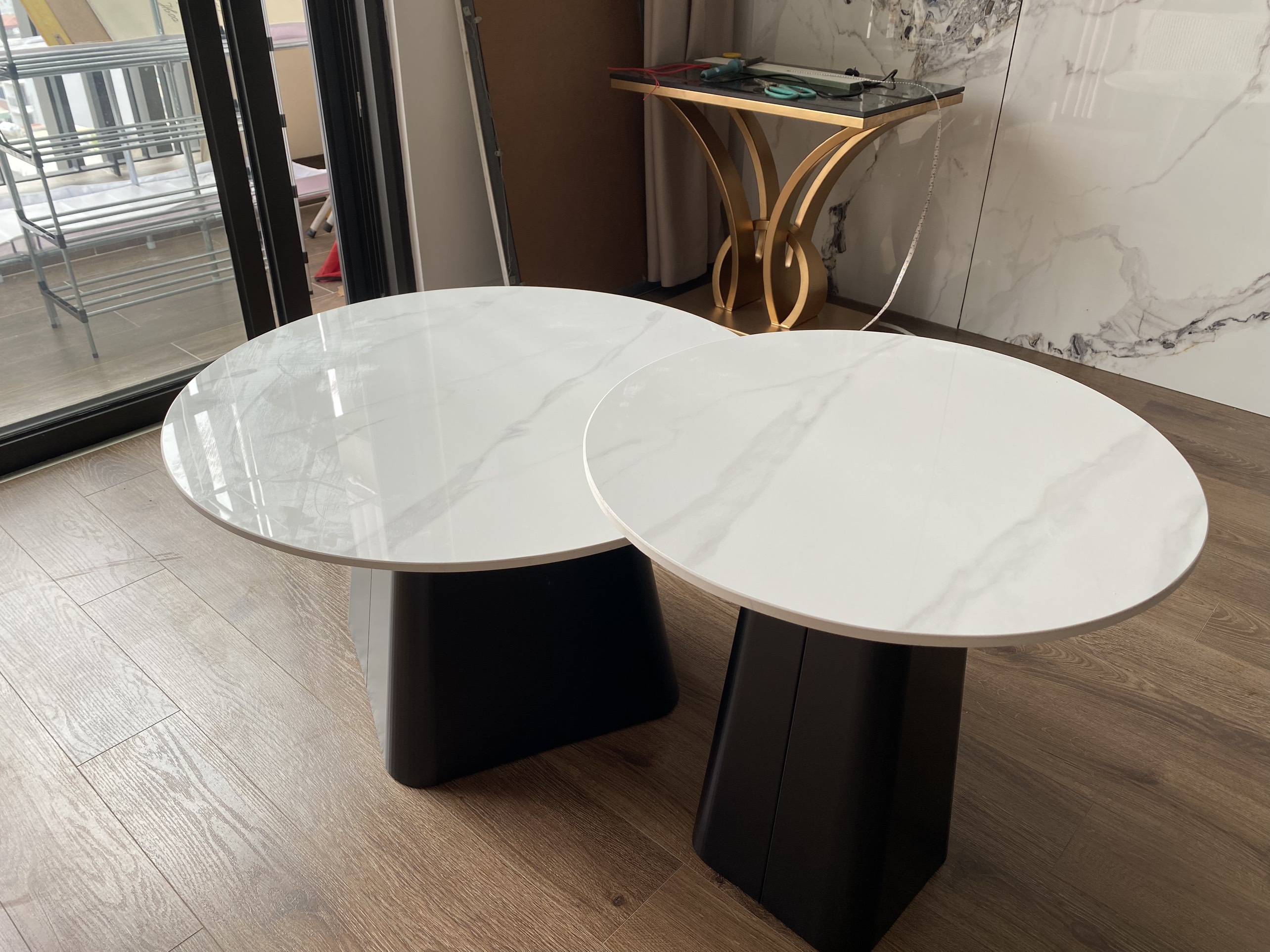 +Kích thước: bàn lớn 70cm x cao 45 x bàn nhỏ 50cm x cao 40cm +Khung sắt sơn màu đồng , mặt bàn kinh .
