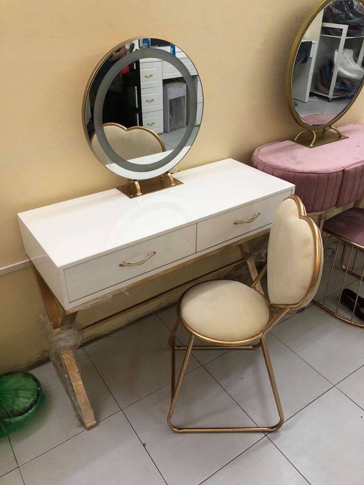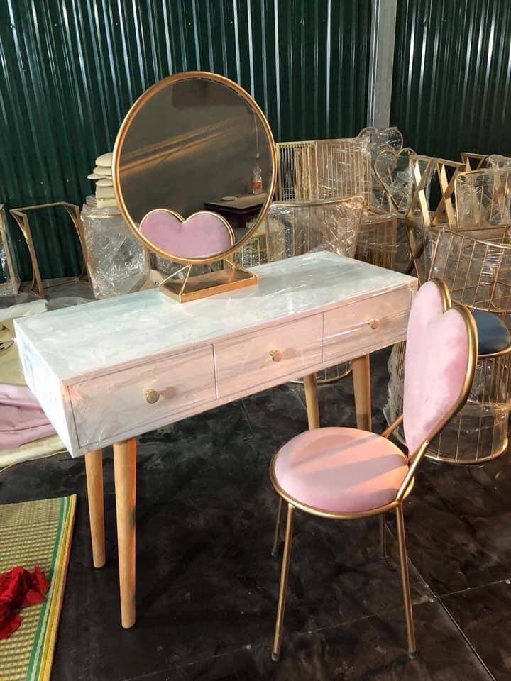 Bộ bàn trang điểm GT03 với đầy đủ 3 món gồm bàn, ghế và gương trên bàn với khung chân sắt sơn màu vàng đồng sang trọng, ghế chữ X nệm ngồi êm ái, khung gương tròn trên bàn di động màu vàng đồng, kích thước bàn nhỏ nhắn 40x100cm không chiếm nhiều diện tích với 2 hộc kéo giúp tăng khả năng lưu trữ rất tiện lợi.