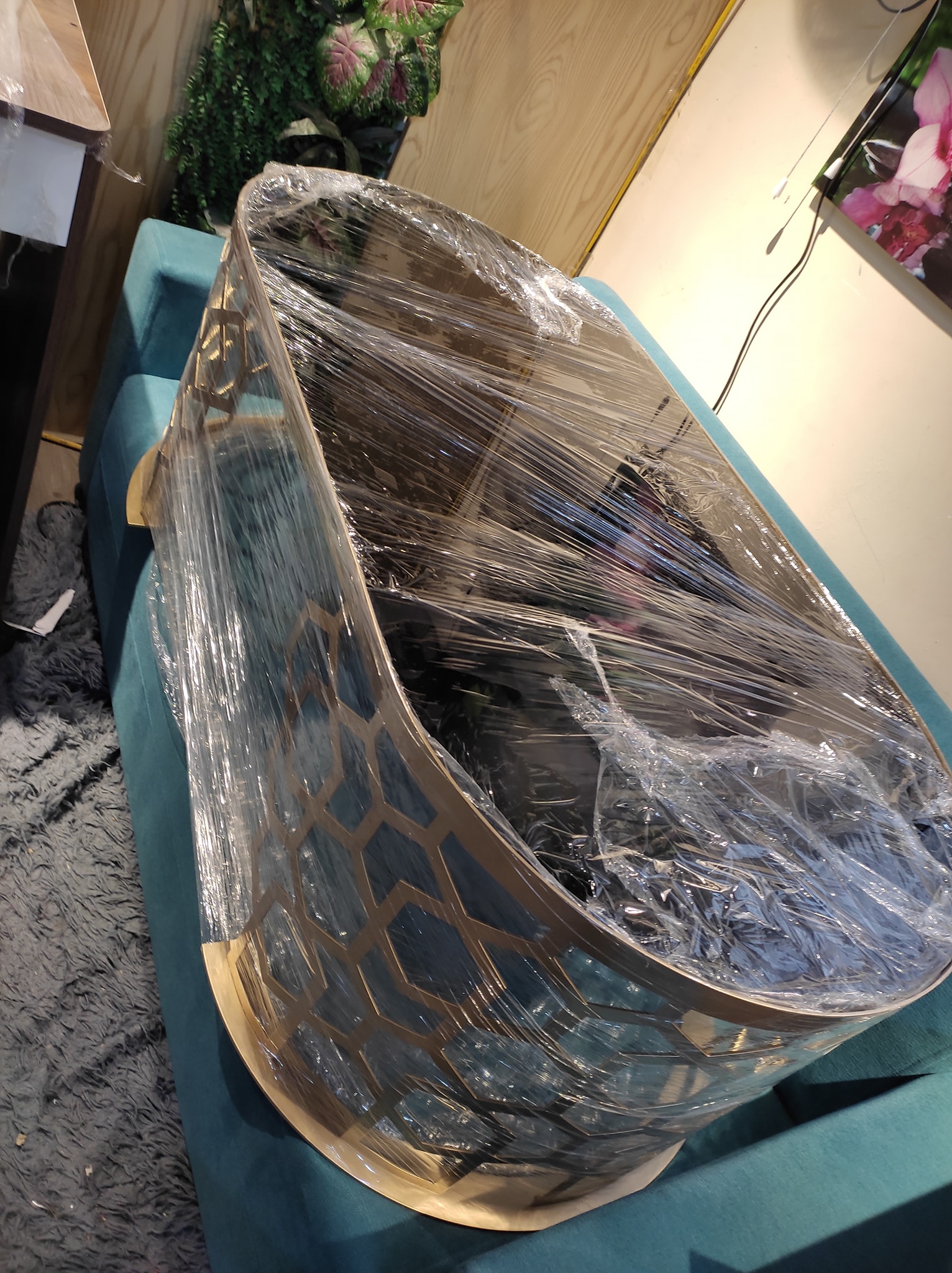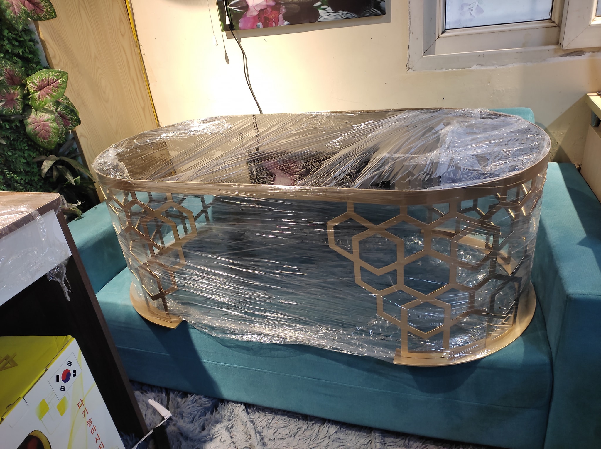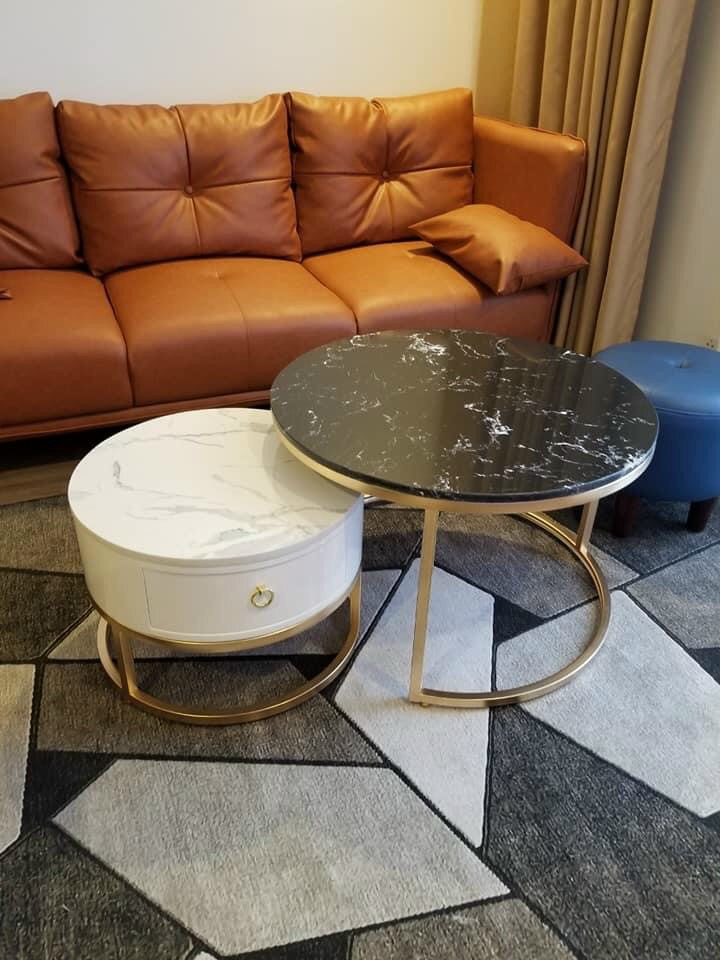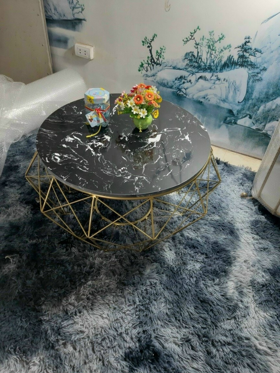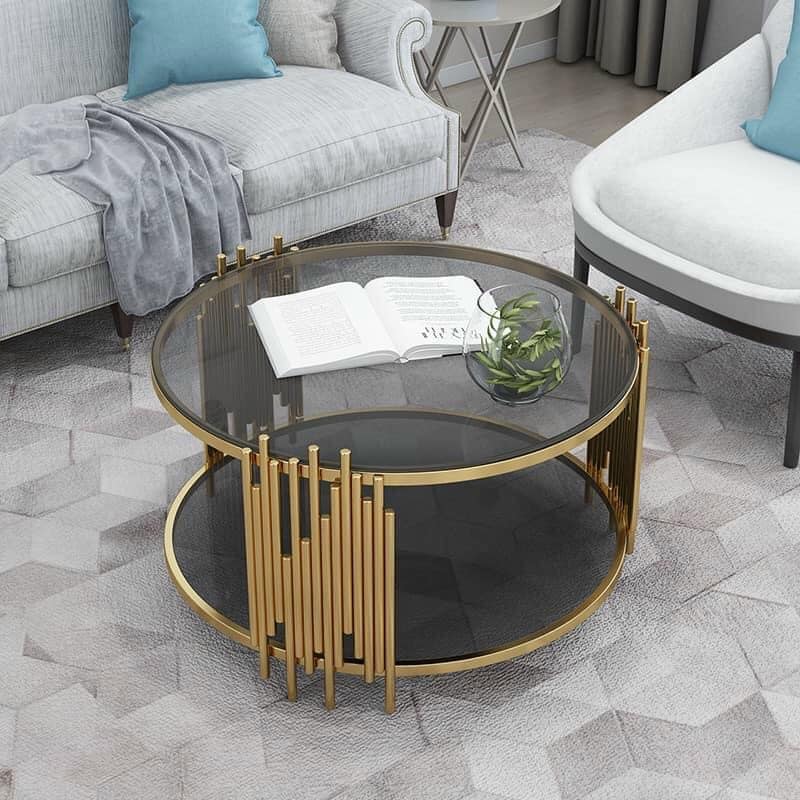 1. Bàn trà hình tròn kính đen chân sắt mạ vàng