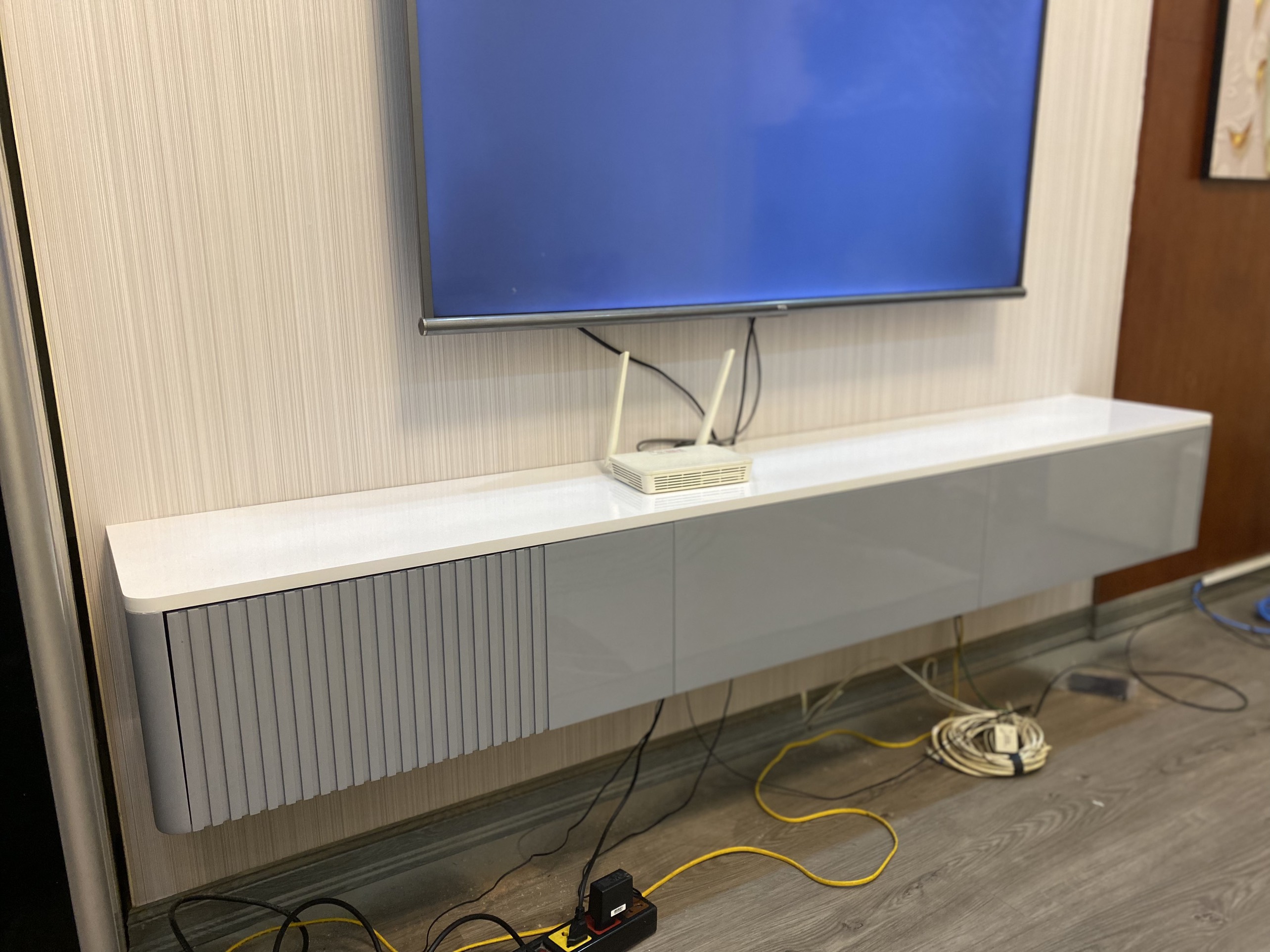 Kệ tivi thiết kệ mặt kế màu trắng , phần thân và ngăn kéo chạy cánh huỳnh màu ghi cực đẹp và tinh tế