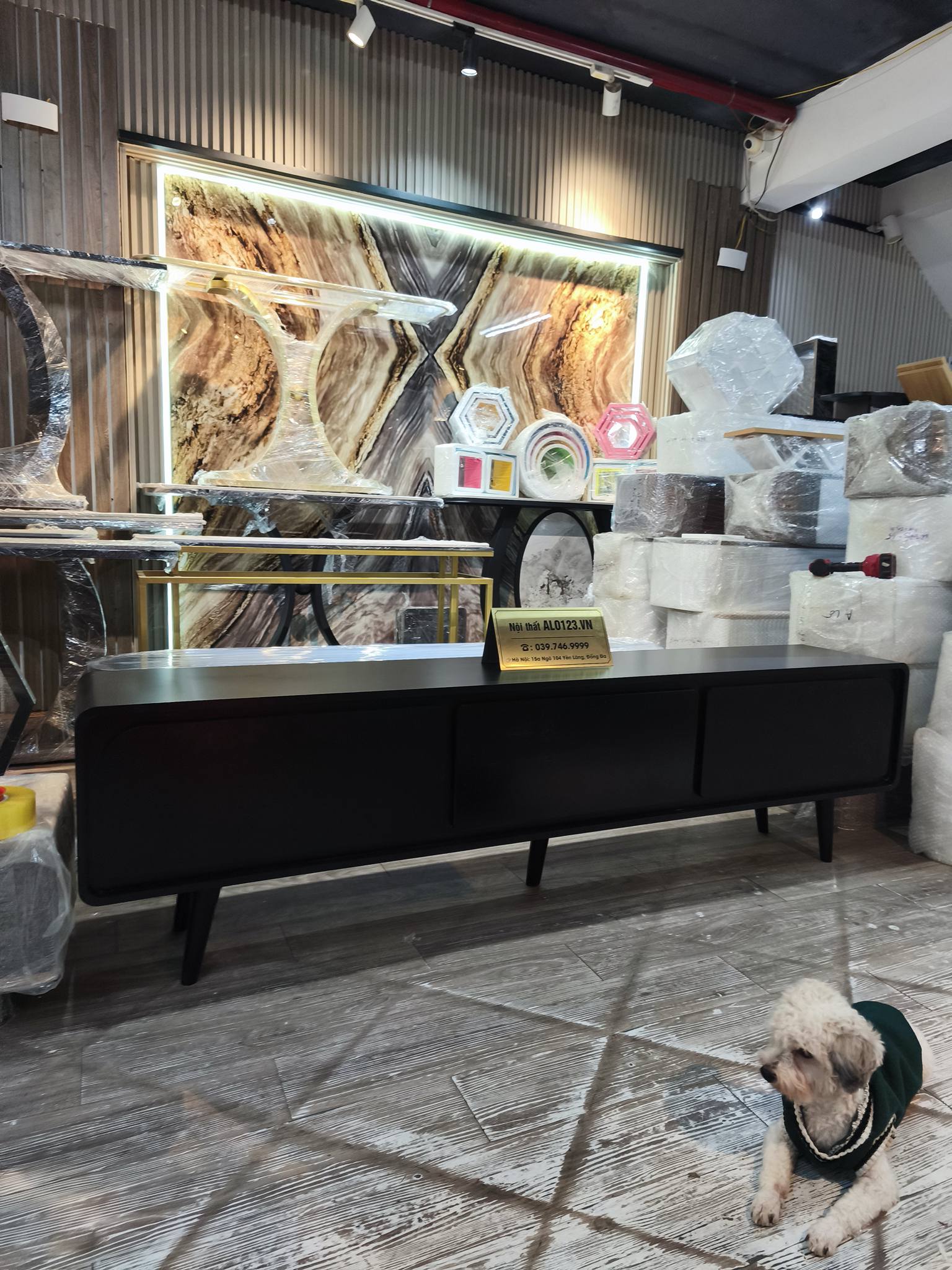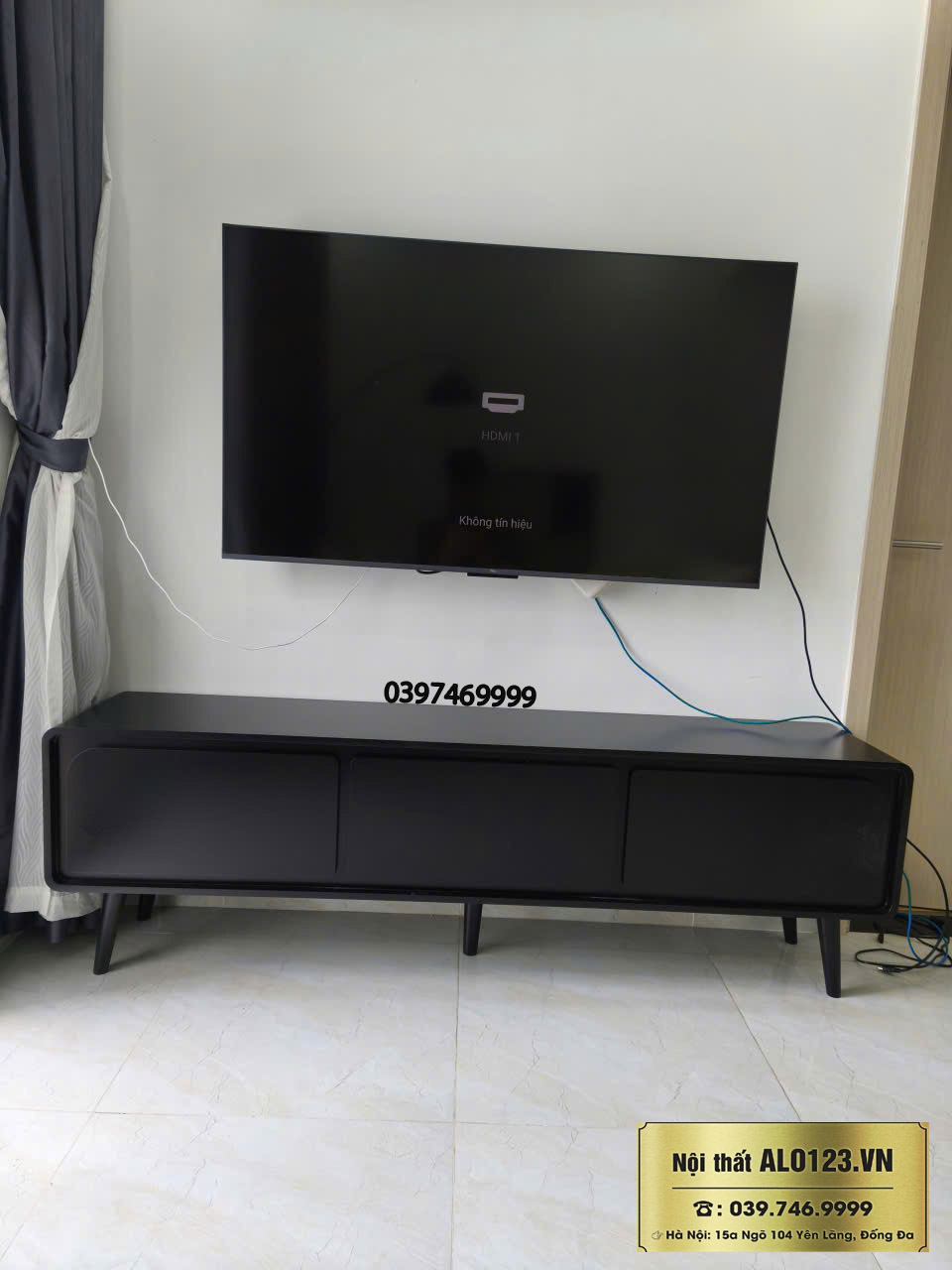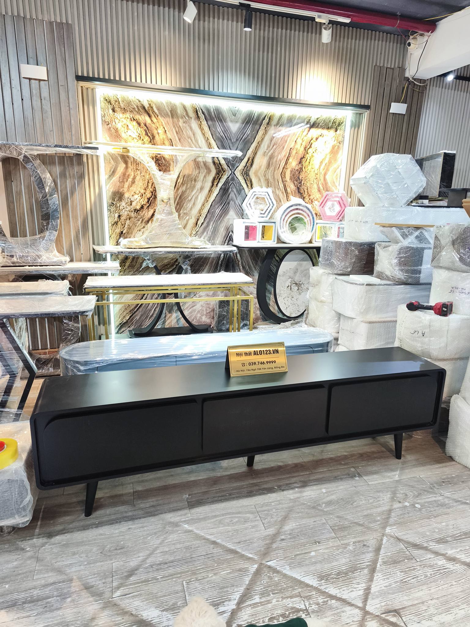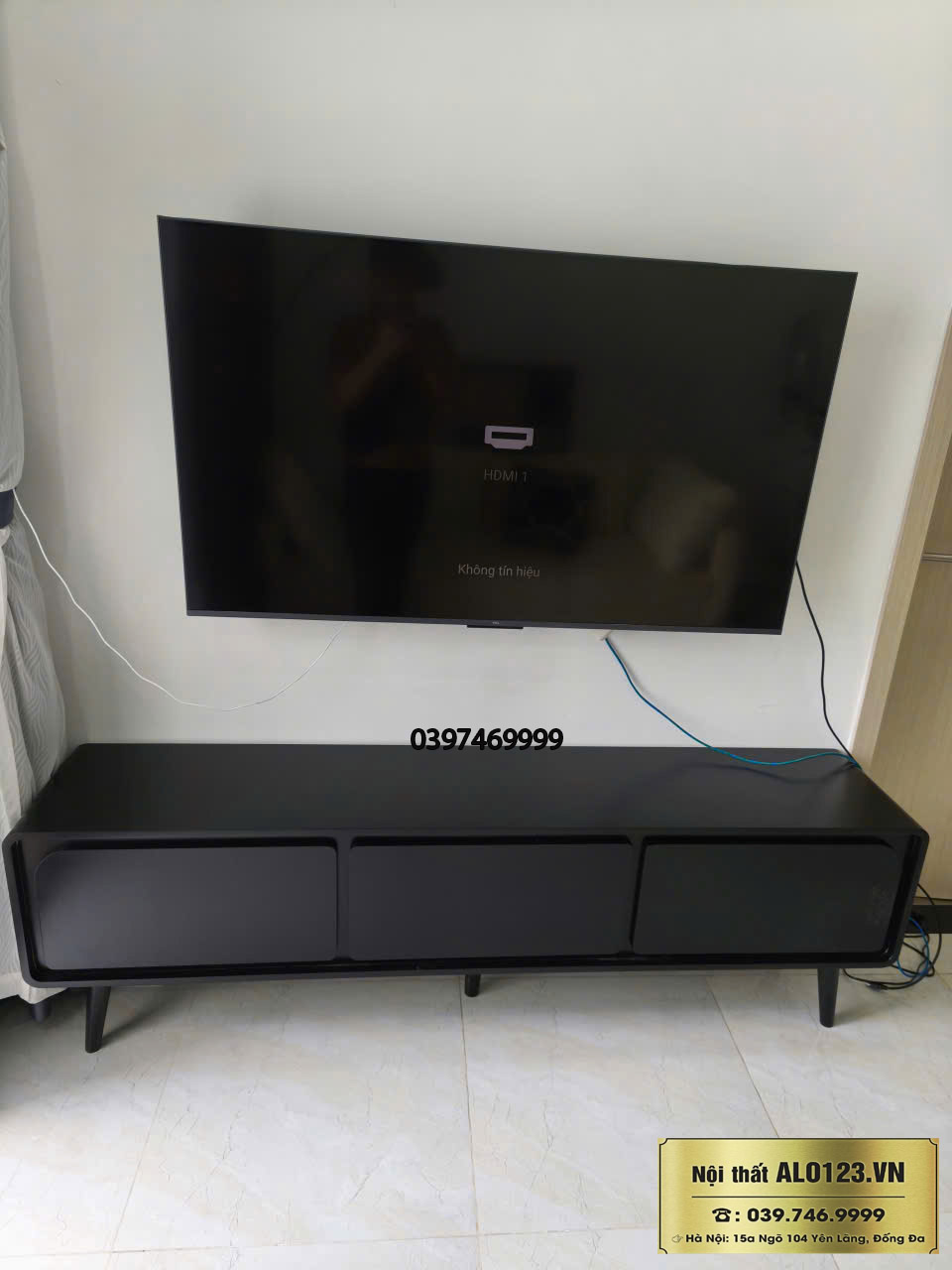Xưởng sản xuất nội thất gỗ ALO123 giới thiệu cả nhà mẫu kệ tivi đặt sàn phẳng màu full đen