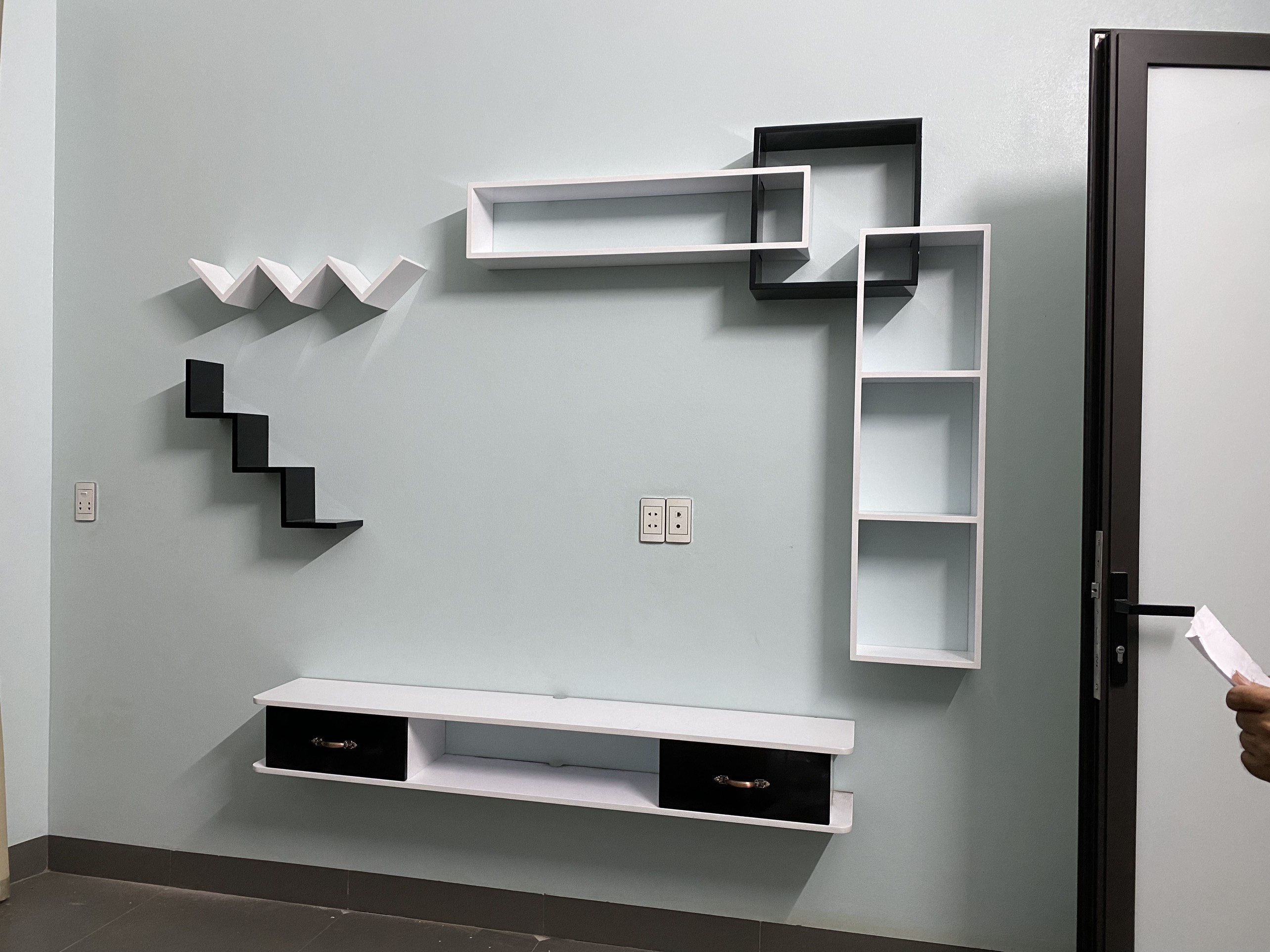 - Sét kệ bao gồm: 01 kệ tivi ngăn kéo dài 160cm sâu 25cm cao 20cm. Vế L dài 140x120cm sâu 15cm, w: 60cm sâu 15cm