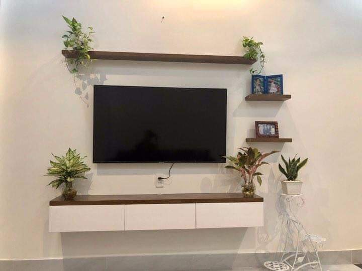Kệ tivi treo tường Màu vân gỗ kết hợp thanh ngang tạo lên điểm nhấn phòng khách mới lạ